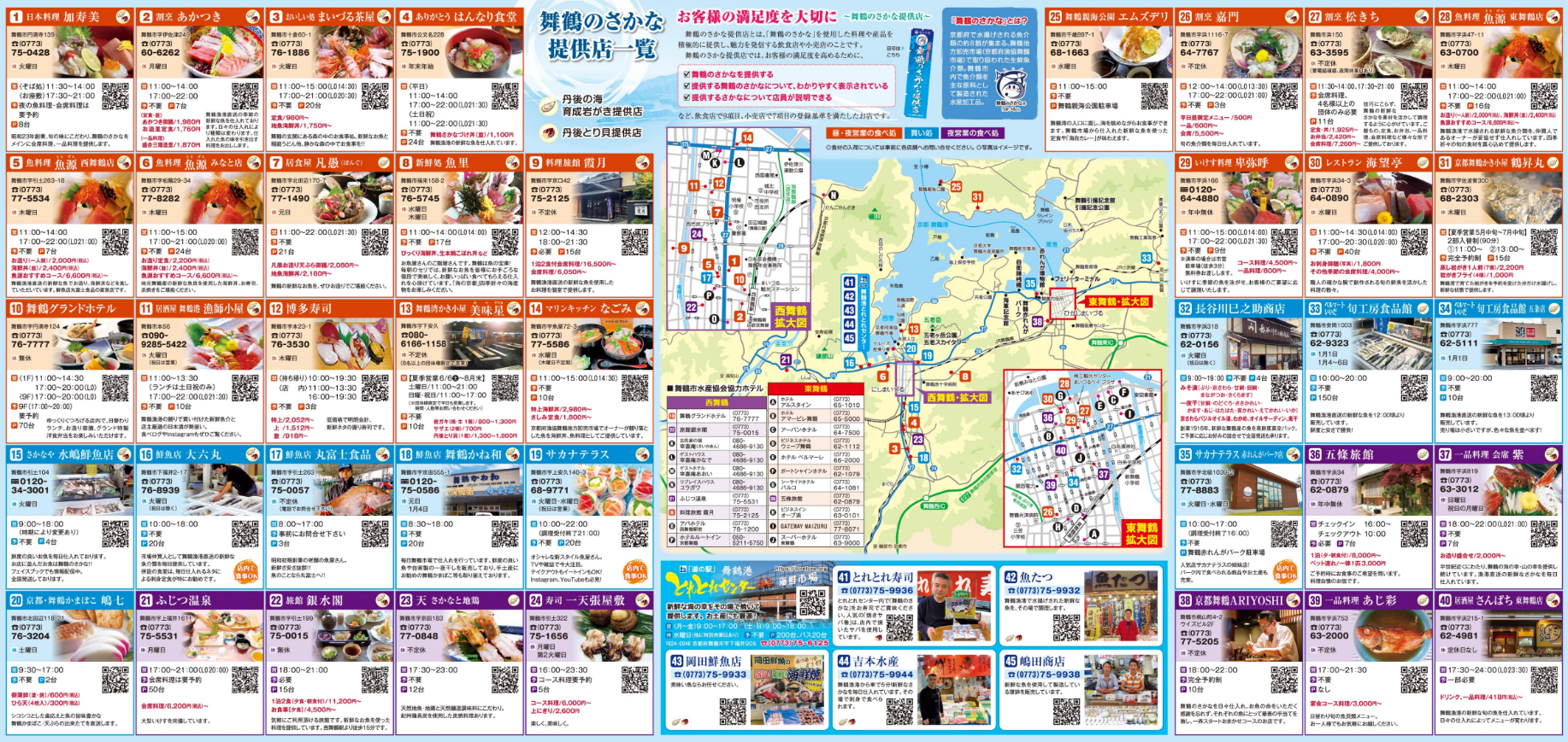 ※【店舗面】のPDFファイルは、各店のQRコード部分をクリックすると舞鶴市水産協会HPの各店の紹介ページにジャンプし、より詳しい情報をご覧いただけます。また、「舞鶴のさかな提供店」を除く「舞鶴市水産協会協力ホテル」部分からは、各ホテルHPへのリンクが設定してありますので、各ホテルの宿泊予約等にご活用下さい。